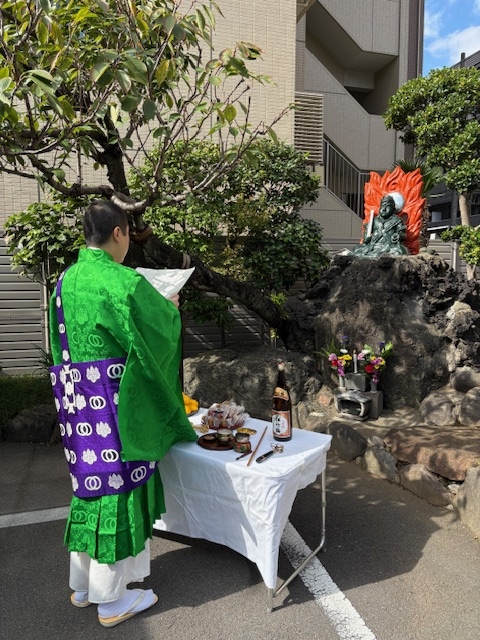 交通安全祈願を行いました。 2025年10月28日 本日、秋晴れの中、弊社にご鎮座まします日暮里不動明王(日暮里不動尊)のご縁日にて、真言宗豊山派 長久院 のご住職を招き、交通安全祈願を執り行ないました。 毎月28日は不動明王のご縁日とされ、弊社では毎年10月28日に交通安全祈願を兼ねてご供養させて頂いております。 社長はじめ職員一同が、全乗務員の家内安全、交通安全、無病息災など祈願いたしました。